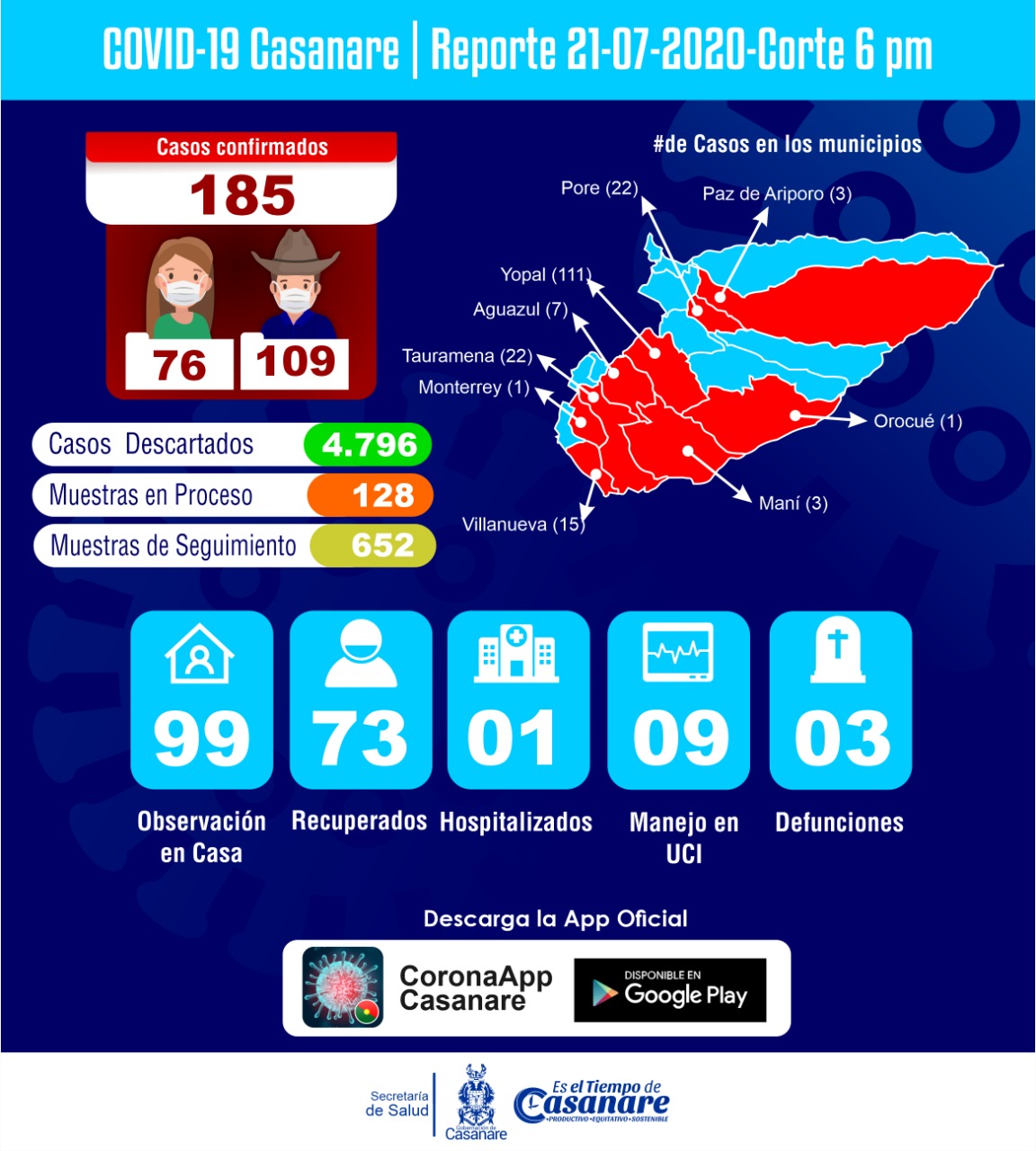 A la fecha, el departamento asciende a 185 casos notificados como positivos de Coronavirus, de los cuales 73 son pacientes recuperados, 99 con aislamiento obligatorio en casa, un (1) paciente que se encuentra en hospitalización, nueve (9) en Unidad de Cuidados Intensivos (UCI) y tres (3) muertes confirmadas por Covid-19.