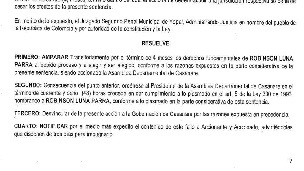 El juzgado segundo penal de Yopal emitió fallo en el proceso de tutela interpuesta por Robinson Luna contra la Asamblea por haber vulnerado su derecho a ser elegido y el debido proceso.