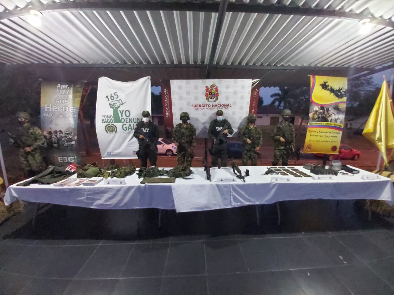 Durante la operación, se incautaron dos armas largas tipo fusil, un arma corta tipo pistola, un radio de comunicaciones base, abundante munición de diferente calibre, panfletos con propaganda subversiva que se distribuía en el sector para el cobro de extorsiones y material de intendencia, que junto al menor recuperado fue dejado a disposición de las autoridades competentes.
