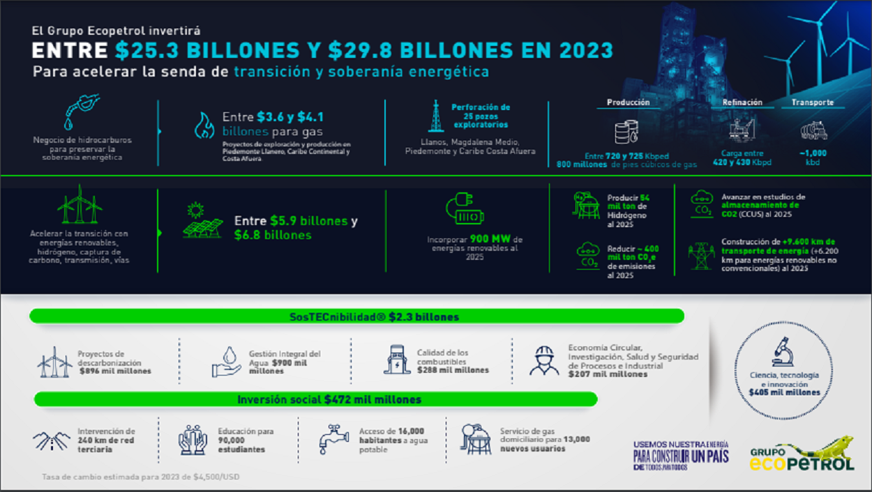 Ecopetrol S.A. (BVC: ECOPETROL; NYSE: EC) informa que su Junta Directiva aprobó el plan general de inversiones orgánicas para el Grupo Ecopetrol con un monto estimado entre COP 25.3 y COP 29.8 billones para el 2023.