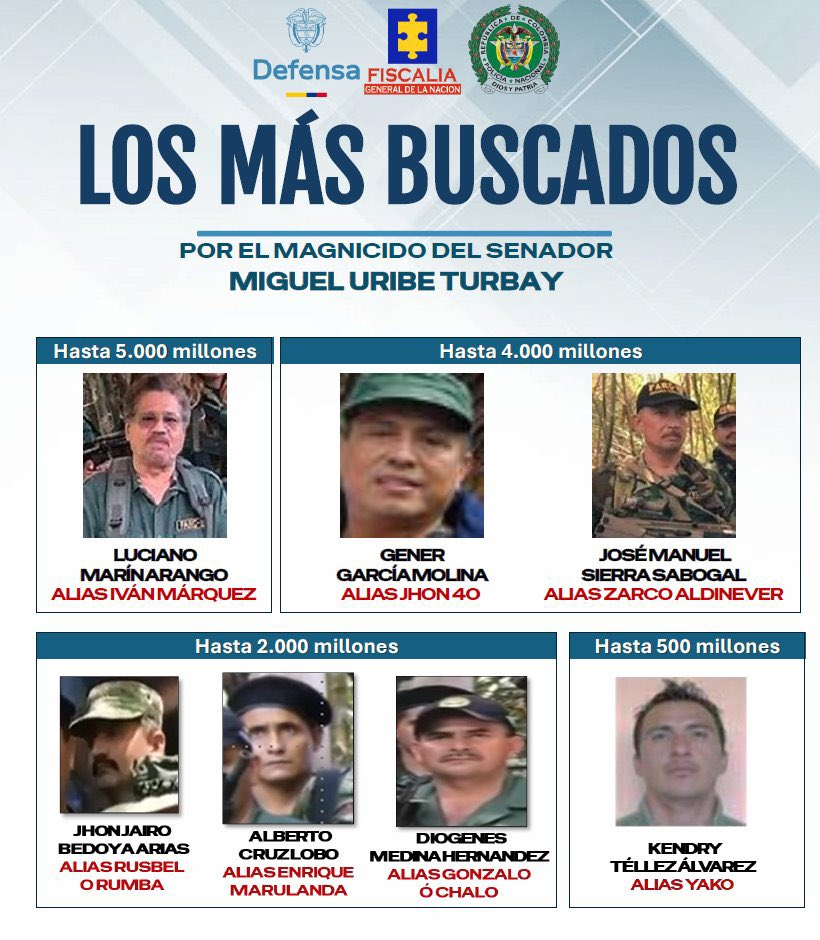 La Fiscalía General de la Nación reactivó las órdenes de captura contra los principales cabecillas de la estructura disidente «Segunda Marquetalia», vinculándolos formalmente como los determinadores del magnicidio del senador Miguel Uribe Turbay. La fiscal general, Luz Adriana Camargo, señaló que el crimen fue motivado por una jerarquía superior del grupo armado con el objetivo deliberado de impactar la estabilidad democrática y los procesos políticos del país. En el nuevo cartel de los más buscados publicado por el ente acusador, la lista es encabezada por alias «Iván Márquez», seguido de «Jhon 40» y «Zarco Aldinever», a quienes se les atribuye la planeación intelectual del atentado.