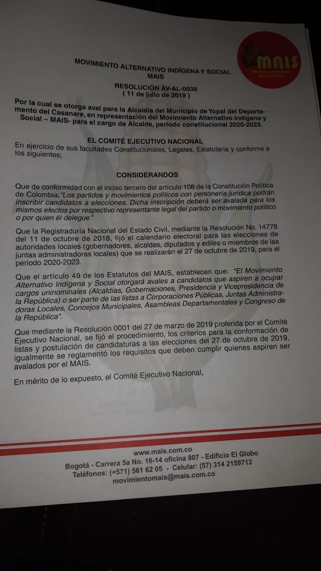 El Movimiento Alternativo Indígena y Social MAIS avaló a JOSE LUIS RODRÍGUEZ a la alcaldía de Yopal, desde hace días a este movimiento político lo había estado rondando varios precandidatos a la alcaldía buscando su aval o respaldo, respaldo que finalmenteno logró Rodríguez conocido socialmente como El Puma.