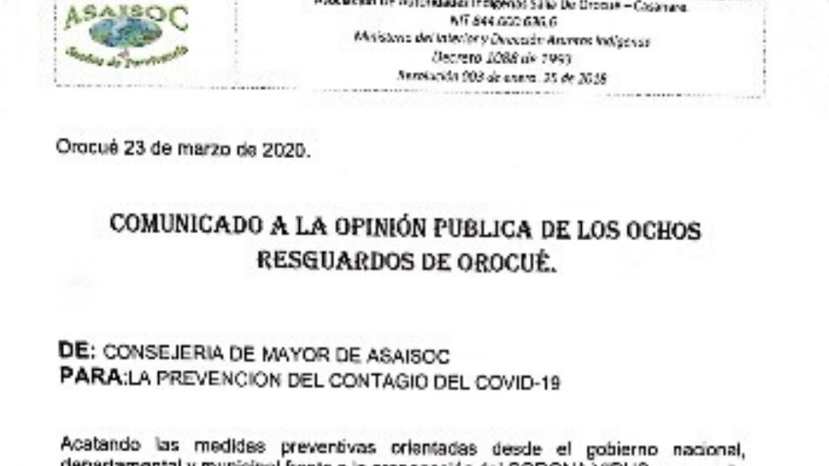 En el comunicado se señala que se están acatando las medidas preventivas orientadas desde el gobierno nacional para prevenir la propagación del covid19, por esta razón desde la fecha y por tiempo indefinido la atención al público en las oficinas de la asociación de indígenas de Orocué queda suspendida.
