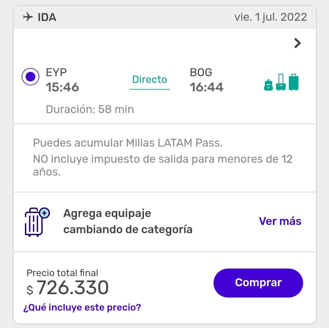El precio Yopal – Bogotá llega a 720 mil pesos; mientras que de Bogotá a diferentes ciudades es mucho más cómodo, incluso hacia el exterior. A San Andrés solo 246 mil, a Medellín 176 mil y a Cali 159 mil, a Miami $ 1.151.000.
