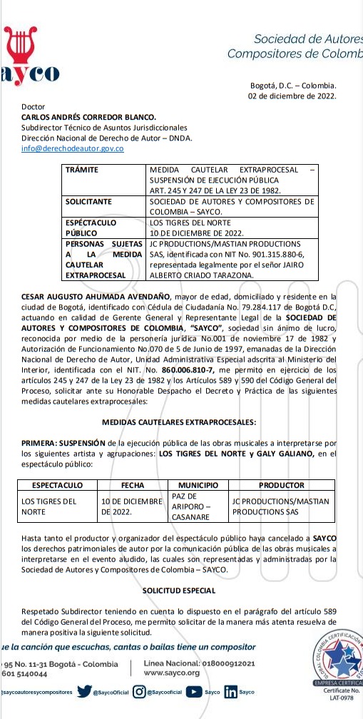 Sayco solicitó suspender el concierto de los Tigres del Norte en Paz de Ariporo Actualidad Sayco solicitó suspender el concierto de los Tigres del Norte en Paz de Ariporo admin 5 diciembre, 2022 Leer Más