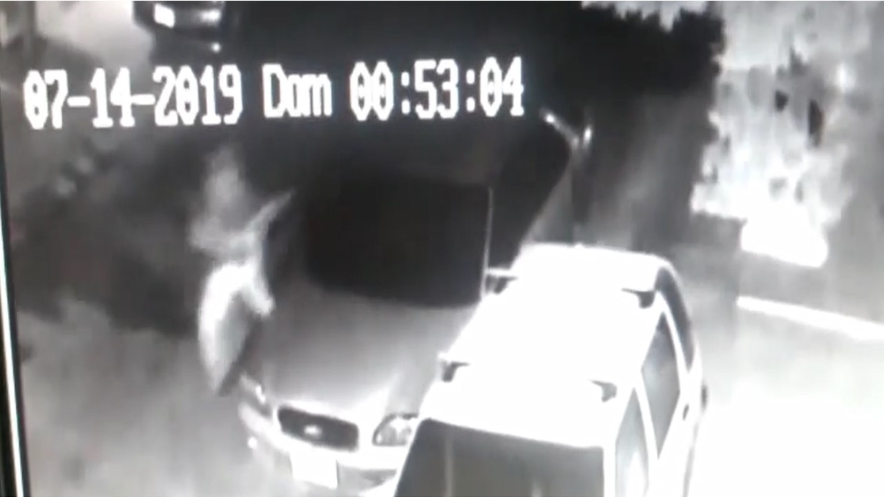Cámaras de seguridad, grabaron el momento en que dos individuos pasa corriendo cerca de un automotor que...