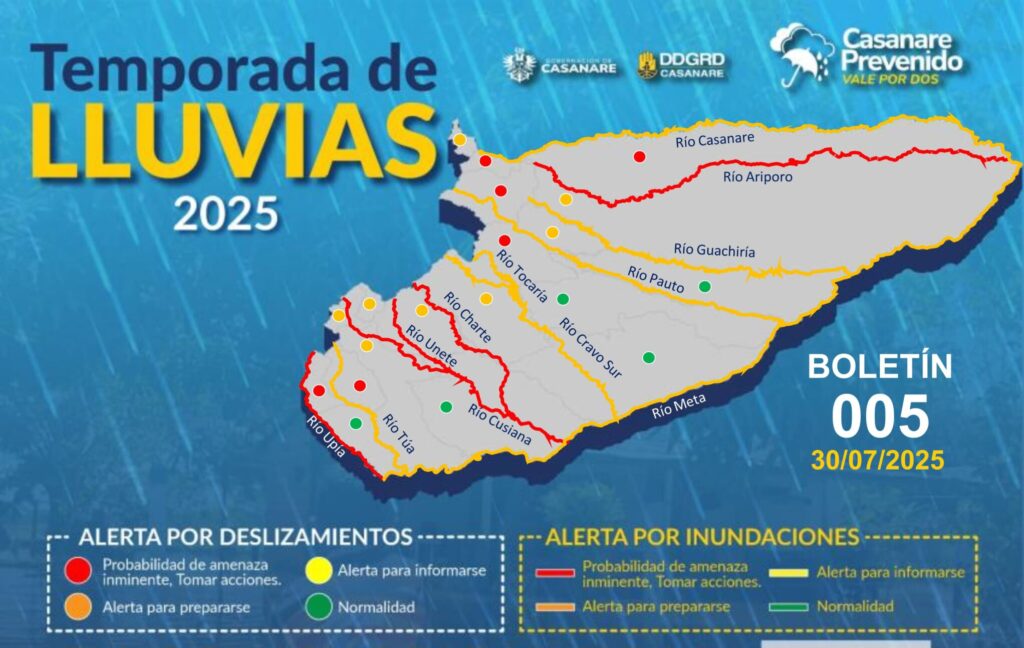 La situación es crítica en varios frentes. Se mantiene alerta roja por inundación en los ríos Upía, Cusiana, Unete, Charte y Ariporo, mientras que los municipios de Hato Corozal, Monterrey, Sabanalarga, Sácama, Nunchía y Támara enfrentan una alta amenaza de deslizamientos, lo que tiene en máxima alerta a las autoridades.