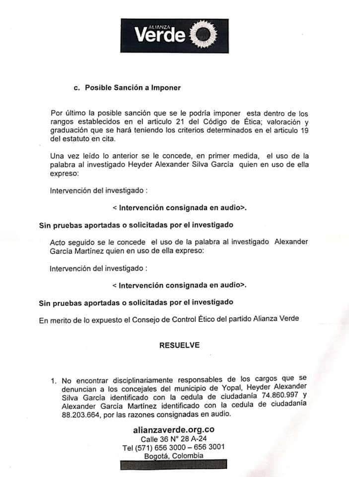 La dirección nacional del partido Verde reversó decisión de la dirección departamental en la que sancionaba sin...