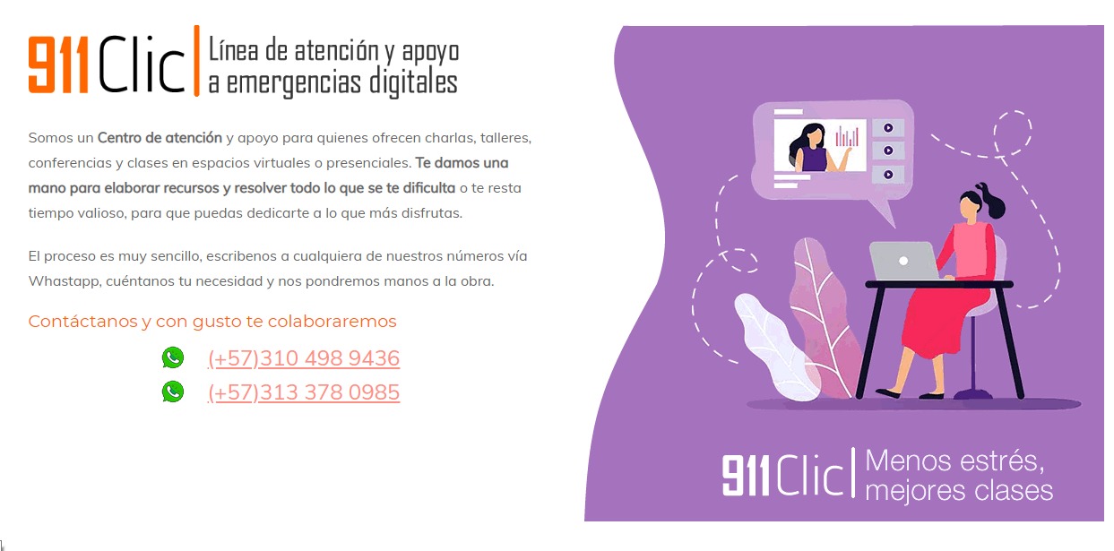 911clic es una que sirve de Centro de atención y apoyo para quienes se desempeñan en actividades pedagógicas y educativas, en espacios virtuales o presenciales. La situación actual ha puesto patas arriba a gran parte (o a casi toda) la comunidad educativa. En muy poco tiempo han cambiado muchas cosas, millones de alumnos y profesores se refugiaron tras el computador, la Tablet o el móvil y la internet para continuar sus labores formativas. Lo que para muchos es la oportunidad de fortalecer los modelos de aprendizaje digitales, para otros se convirtió en un verdadero desafío. Un desafío para el que muchos no estaban preparados.
