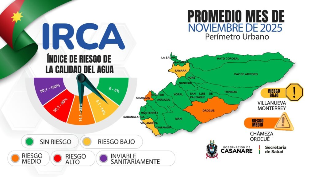 La Secretaría de Salud de Casanare entregó el reporte del Índice de Riesgo de la Calidad del Agua correspondiente a noviembre de 2025, con los resultados del monitoreo físico, químico y microbiológico en las zonas urbanas de los municipios del departamento.