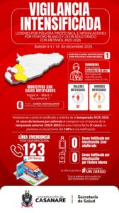 Con corte al 14 de diciembre de 2025, uno de los casos fue notificado en las últimas 24 horas. Las personas lesionadas se registraron en los municipios de Yopal, Maní y Tauramena, con mayor concentración en la capital del departamento.