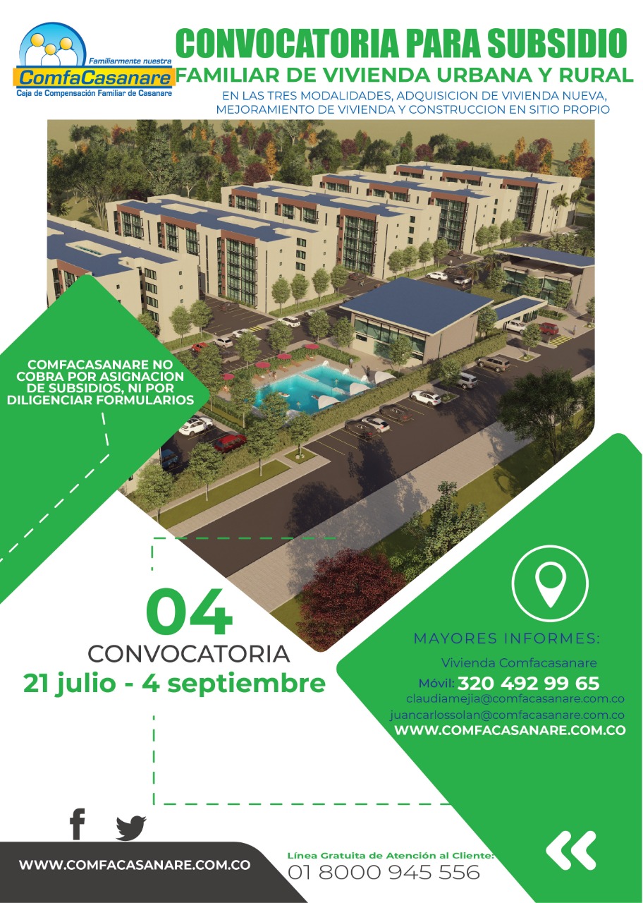 La caja de compesación familiar de Casanare-Comfacasanare, informa que está abierta la convocatoria para subsidio familiar de vivienda urbana y rural en sus tres modalidades, adquisición de vivienda nueva, mejoramiento de vivienda y construcción en sitio propio, desde el 21 de julio al 04 de septiembre del año en curso.