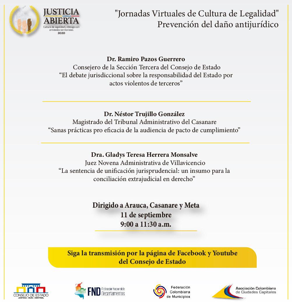 “Jornadas virtuales de cultura de la legalidad” prevención del daño antijurídico, se ha denominado esta actividad organizada por el Consejo de Estado, la Federación de Departamentos, Federación de Municipio y las Asociación de Capitales de Colombia, con el objetivo de difundir un conocimiento que permita a la administración pública ajustar algunas conductas que generan inconvenientes (incluso de corte litigioso) con los ciudadanos, permitiendo con ello la descongestión de los despachos, la disminución de condenas judiciales, y una adecuada destinación de los recursos públicos.