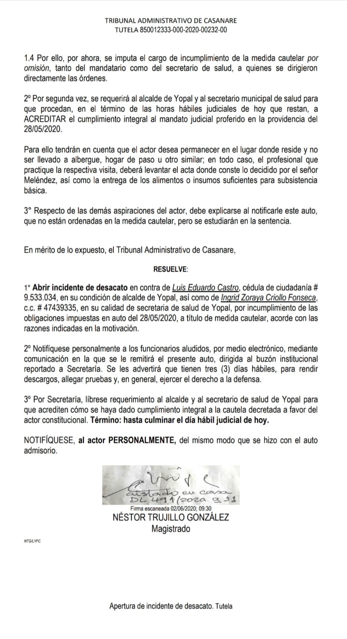 Aunque la tutela esta contra el Presidencia de la República, departamento de Casanare, Ministerio de Salud y municipio de Yopal. La medida cautelar fue dirigida al municipio de Yopal, que según el Tribunal Administrativo de Casanare no ha sido resuelta y le dio Plazo para responder a más tardar, hasta el mediodía del 02/06/2020, so pena de la apertura de incidente de desacato.