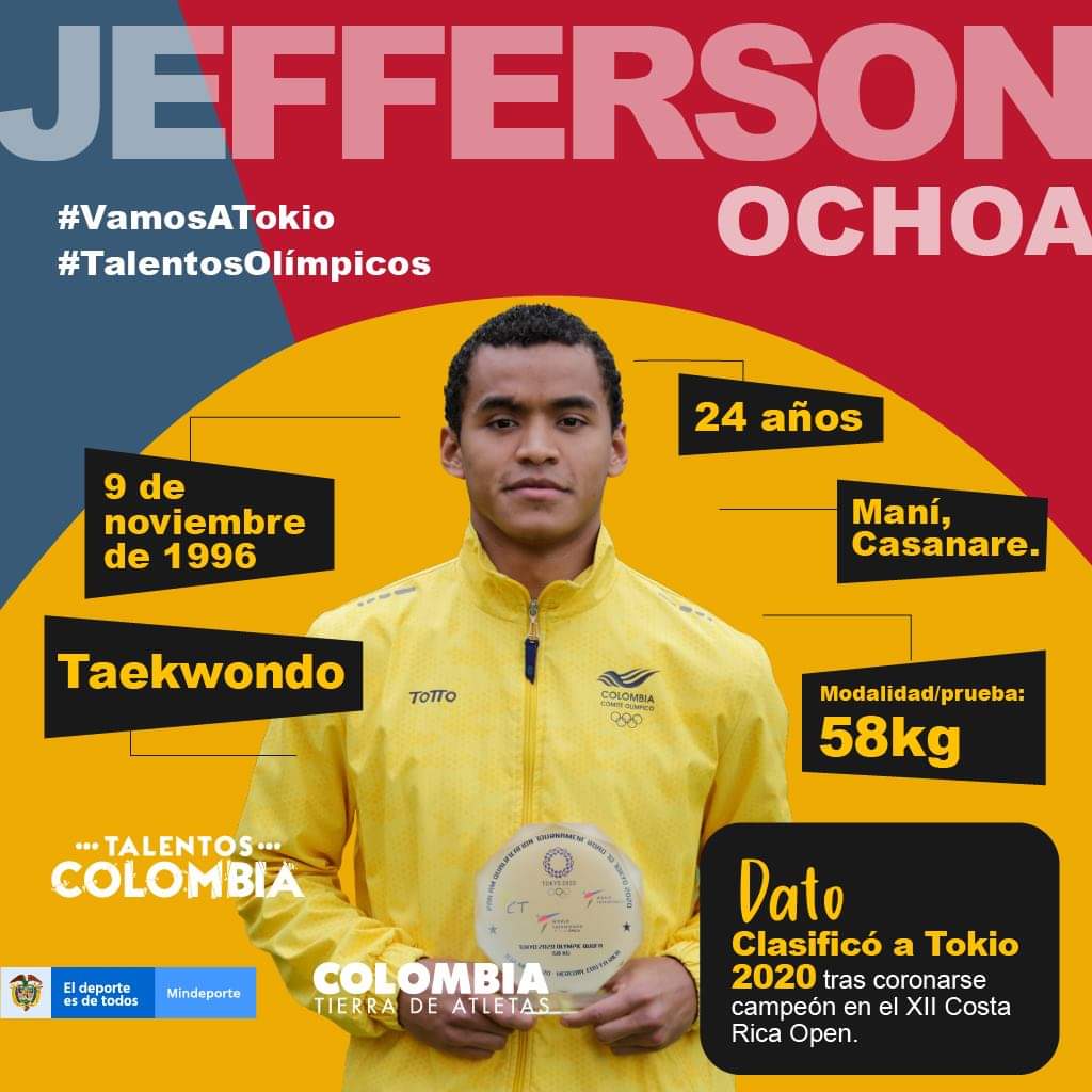 El Deportista & Taekwondista casanareño oriundo del bello municipio de Maní JEFFERSON OCHOA (24 años – 58 Kg) representación de nuestro país COLOMBIA entrará en acción en los JUEGOS OLÍMPICOS TOKIO 2020. HOY viernes 23 de Julio 2021, a las 11:45 P.m.