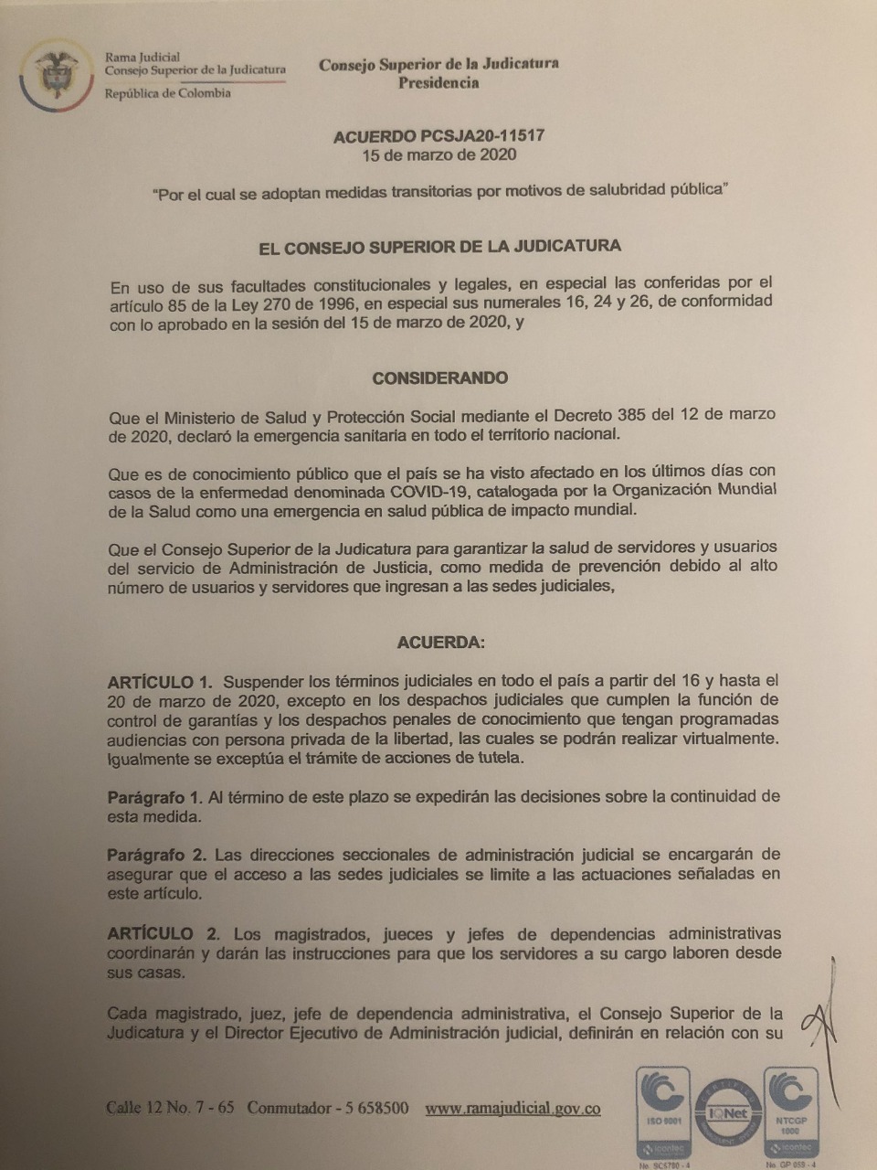 Diana Alexandra Remolina, presidenta del Consejo Superior de la Judicatura, informó en su cuenta de Twitter que de la medida de suspensión de términos se exceptúan los despachos que cumplen funciones de control de garantías, las tutelas y los despachos penales que tuvieran audiencias programadas con personas privadas de la libertad; en este último caso, las audiencias deberán hacerse de forma virtual.