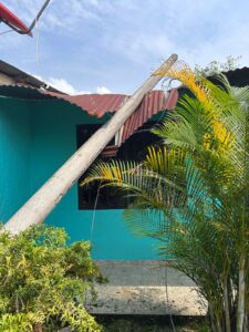 En la vereda Iguaro, la intensidad del viento provocó la caída de un árbol sobre las líneas de media tensión, lo que derivó en el colapso de un poste de energía eléctrica. La estructura impactó directamente contra una vivienda, causando daños considerables en la cubierta (techo) y afectando una de las paredes laterales.