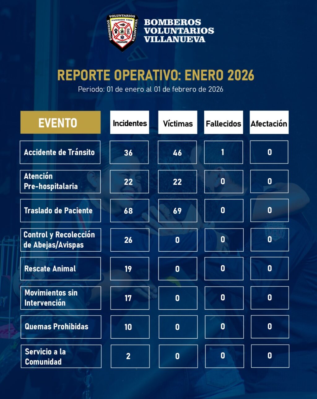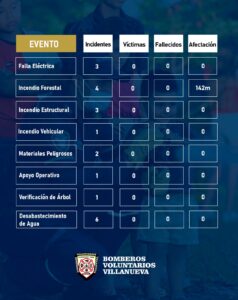 El Cuerpo de Bomberos Voluntarios de Villanueva atendió 241 emergencias durante enero de 2026, según el balance operativo correspondiente al periodo comprendido entre el 1 de enero y el 1 de febrero.