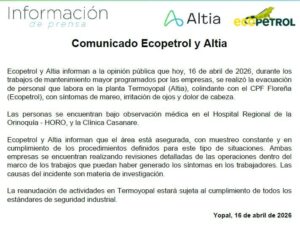 A través de un comunicado conjunto, las empresas Ecopetrol y Altia explicaron que la situación se originó durante trabajos de mantenimiento programado. Al reportarse síntomas como mareos, cefaleas e irritación ocular, se activaron los protocolos de emergencia y se procedió con la evacuación inmediata del personal para garantizar su integridad.