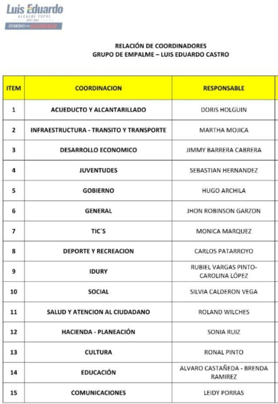 Se conoció la relación de coordinadores de empalme por parte de Luis Eduardo Castro, alcalde electo de Yopal Casanare, aunque el nuevo mandatario ha resaltado que los definitivos, solo se conocerán hasta último momento. Como es lógico, la mayoría de ellos, ocuparía los cargos de secretarios y/o directores de Institutos ya que tienen la responsabilidad de levantar inventario e informe de lo que recibe el nuevo alcalde al interior de cada cartera.