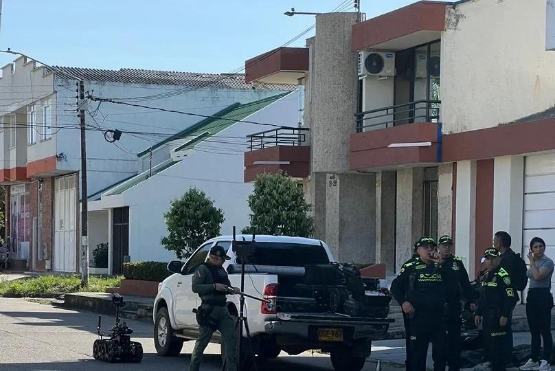 El reporte inicial fue atendido por la patrulla del cuadrante, que procedió a aislar el área mientras se adelantaban las verificaciones de rigor. Un canino antiexplosivos realizó la inspección preliminar y marcó una posible presencia de material sospechoso, por lo que se solicitó la intervención del grupo especializado.