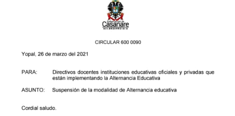 En ese sentido, mediante Circular 600 0090 se ordena suspender la alternancia escolar durante 14 días en el departamento de Casanare, contados desde el 5 hasta el 18 de abril de los corrientes, tiempo en el cual se continuará con la prestación del servicio educativo en la modalidad de trabajo pedagógico en casa.