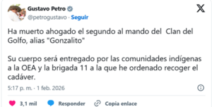 Las autoridades de Colombia han confirmado la muerte de José Gonzalo Sánchez Sánchez, conocido como alias “Gonzalito”, considerado el segundo cabecilla más importante del Clan del Golfo, la mayor organización criminal narcotraficante del país. La información fue corroborada este domingo 1 de febrero de 2026, tras un accidente fluvial ocurrido en el municipio de Tierralta, departamento de Córdoba, en el norte del país.