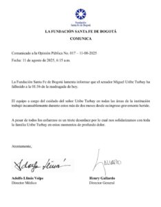 Miguel Uribe Turbay, senador y precandidato presidencial del Centro Democrático, murió en la madrugada del 11 de agosto de 2025, luego de permanecer más de dos meses internado en la Fundación Santa Fe de Bogotá por las graves heridas que le causó un atentado durante un acto de campaña el 7 de junio. La clínica confirmó el deceso en un comunicado oficial y precisó la hora del fallecimiento.