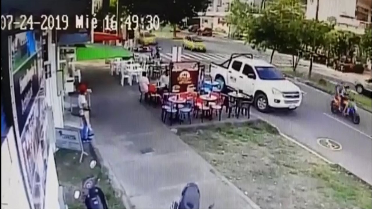 Justamente una cámara de seguridad grabó el momento exacto, cuando un taxista, de manera imprudente, cierra a una motocicleta, haciendo caer a las dos personas que se movilizaban en la misma, una de ellas resultó con fractura de clavícula.