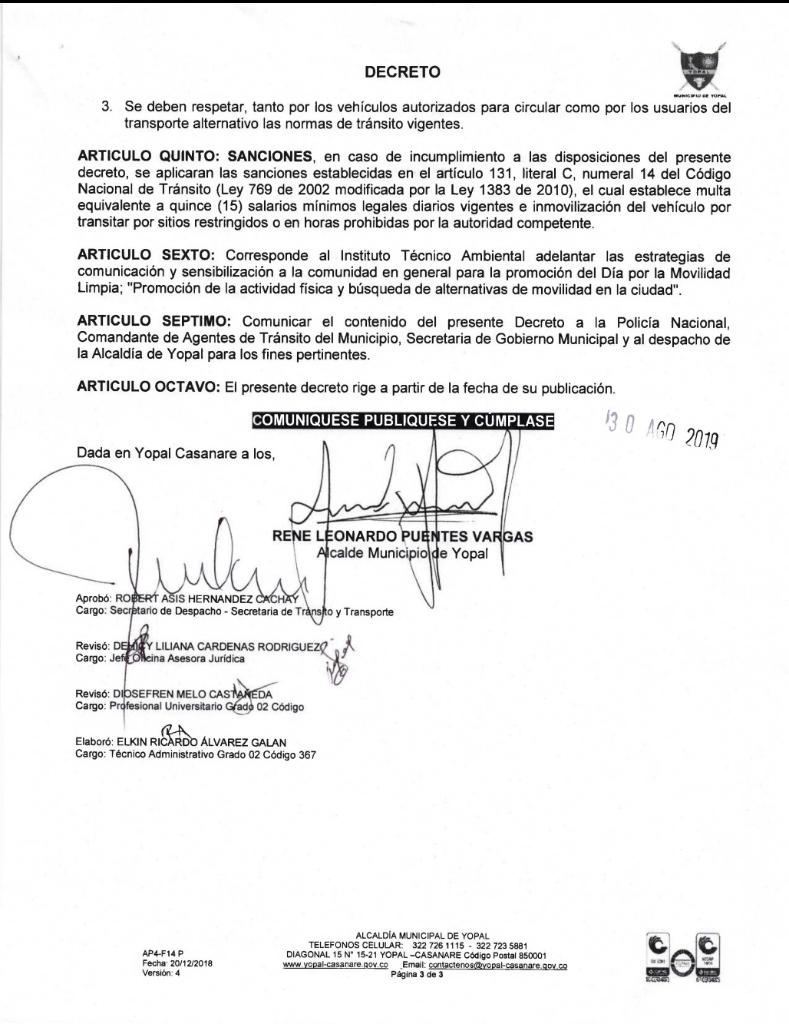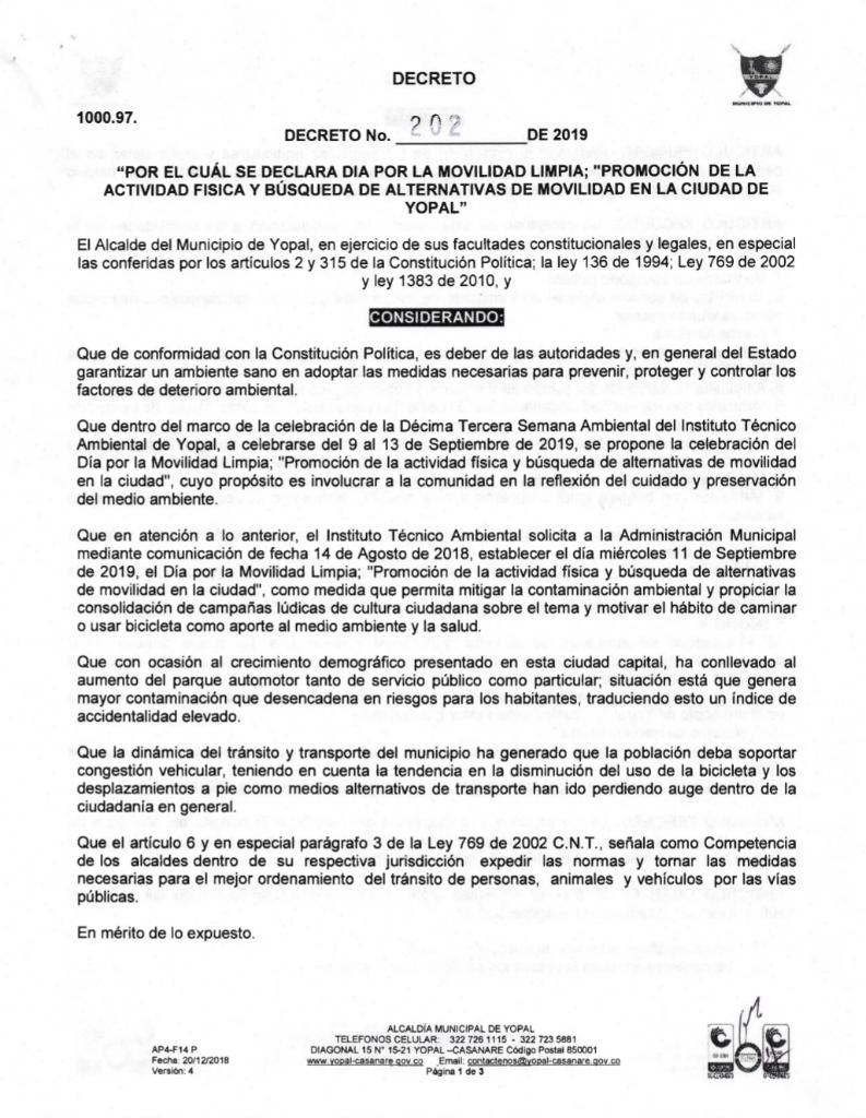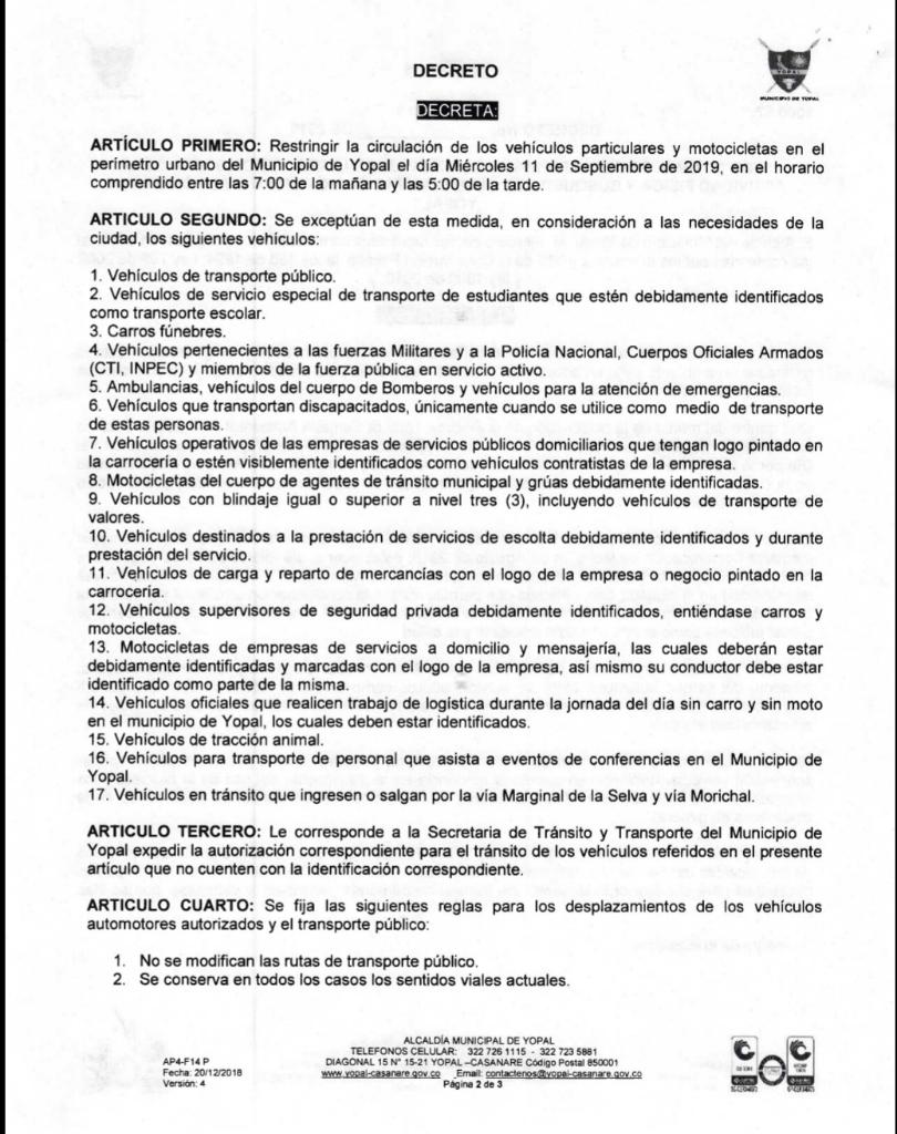 Mediante decreto 202 de 2019, la alcaldía de Yopal declaró el miércoles 11 de septiembre como el ‘Día de la Movilidad Limpia’, la restricción de circulación está contemplada en el horario de 7 a.m a 5 p.m. el incumplimiento acarreará multa equivalente a 15 SMLDV e inmovilización del vehículo.