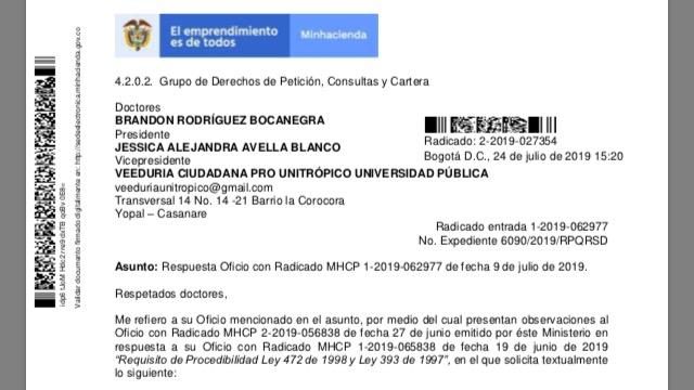 Lea aquí el documento completo emitido por el Ministerio de Hacienda frente a la Universidad Pública en Casanare.
