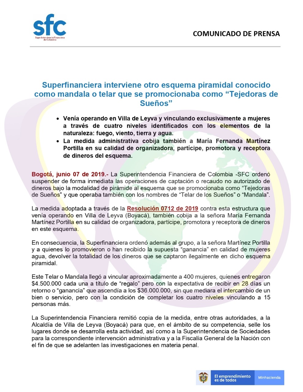 En el municipio de Villa de Leyva – Boyacá, la Superintendencia Financiera mediante Resolución 0712 de 2019, ordenó suspender de forma inmediata la captación o recaudo no autorizado de dineros bajo esta modalidad de pirámide, esquema que se promocionaba como “Tejedoras de Sueños”.