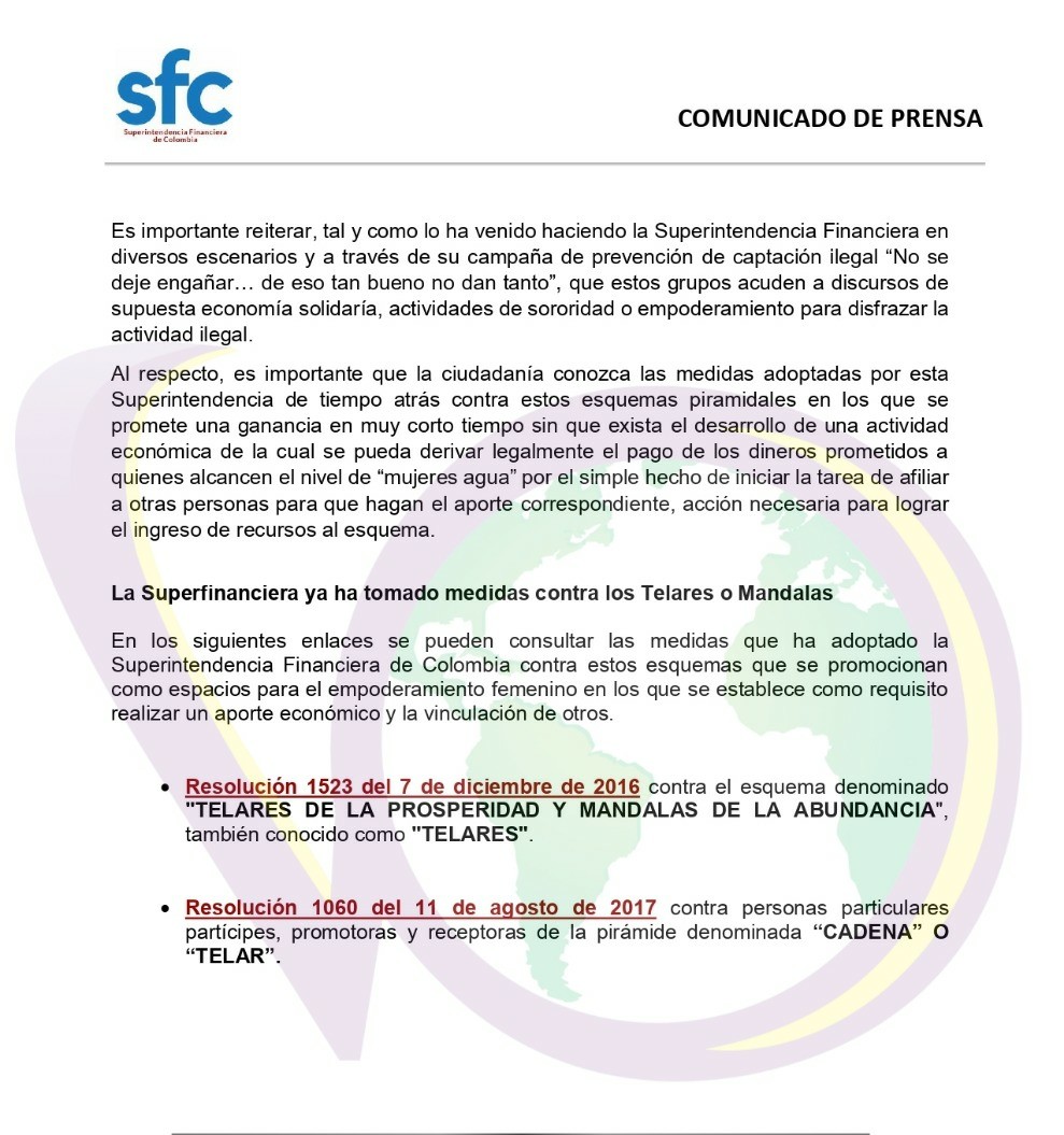 La Superintendencia Financiera reiteró a los ciudadanía la campaña “No se deje engañar… de eso tan bueno no dan tanto”, quienes realizan estas actividades ilegales acuden a discursos de supuesta economía solidaría, actividades de sororidad o empoderamiento para convencer a las personas.