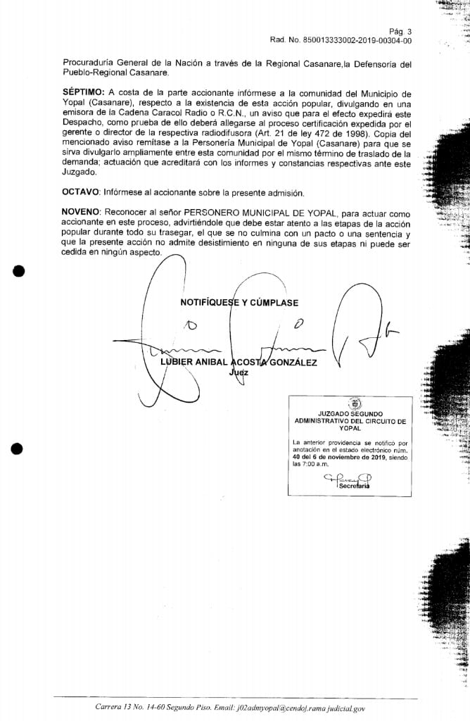 El juez Lubiel Aníbal Acosta, requiere al accionante para que indique los nombres y localización para notificar a los propietarios del predio, así como recuerda a la administración municipal de Yopal, que tiene 10 días para contestar la demanda y solicitar las pruebas que deseen exponer.