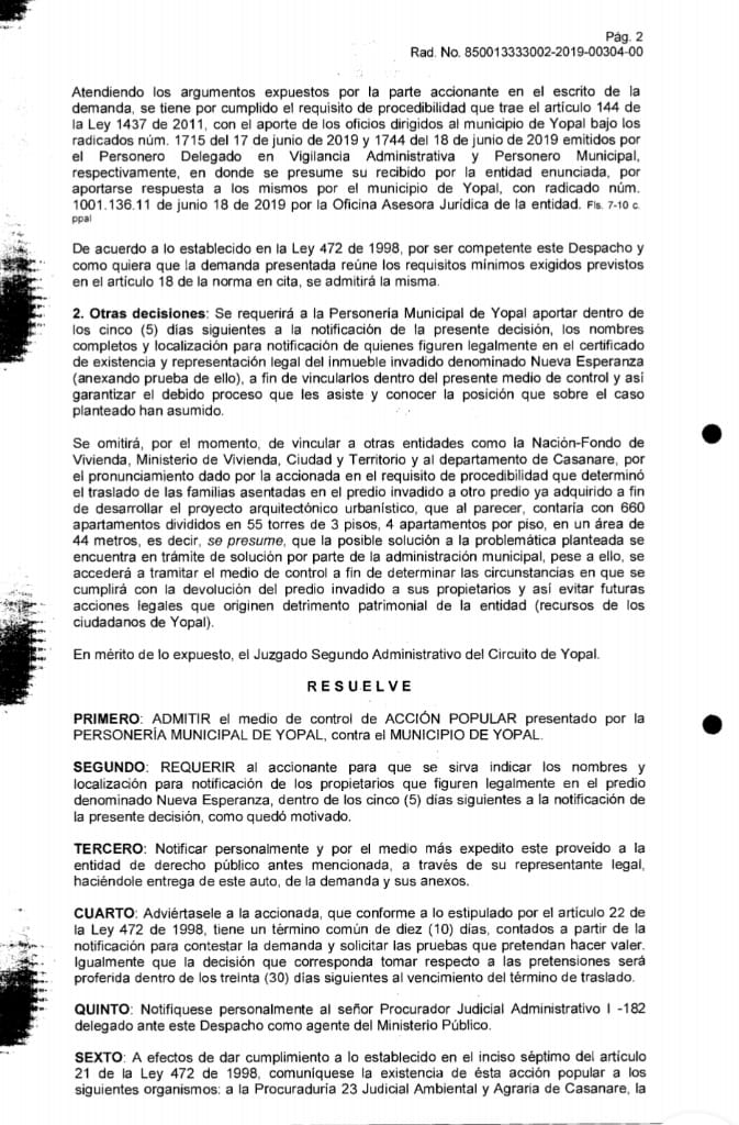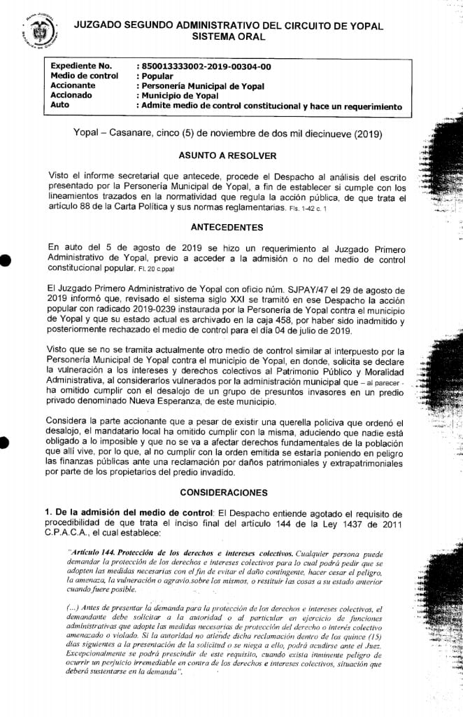 En providencia el pasado 5 de noviembre el Juzgado Segundo Administrativo de Yopal, admitió una acción popular, presentada por la Personería de Yopal, que involucra el asentamiento humano Mi Nueva Esperanza.