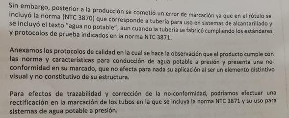 Según el fabricante, en lugar de rotular la tubería con la norma NTC 3871, la cual hace alusión al sistema de agua potable a presión, por equivocación se marcó con el código NTC 3870, que corresponde para uso de alcantarillados y se incluyó para uso de agua no potable.