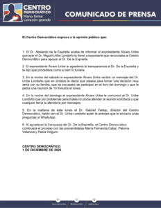 En un comunicado, el partido señaló que el expresidente Álvaro Uribe recibió de parte del también aspirante Abelardo de la Espriella la información de que Uribe Londoño había adherido a su campaña presidencial. Según la colectividad, después de intentar sin éxito comunicarse directamente con el precandidato para confirmar o desmentir la versión, se decidió continuar el proceso interno con las senadoras María Fernanda Cabal, Paloma Valencia y Paola Holguín, conforme al mecanismo acordado de dos encuestas internas.
