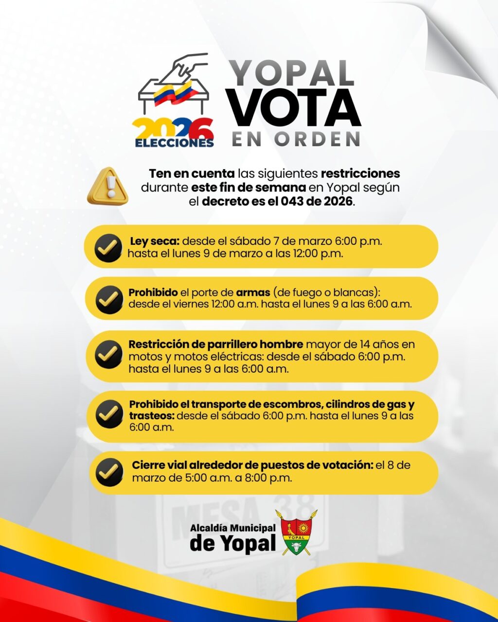La Alcaldía de Yopal expidió el Decreto 043 de 2026, mediante el cual se dictan las medidas de orden público para las elecciones de Cámara y Senado. Las disposiciones incluyen restricciones a la movilidad, al consumo de alcohol y al transporte de materiales en todo el territorio municipal.