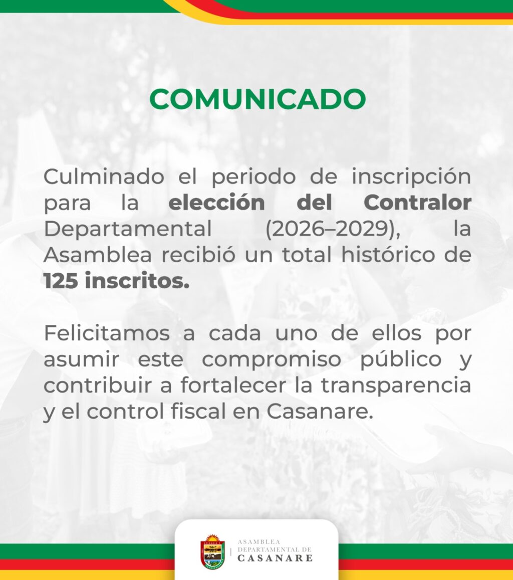 La Asamblea Departamental de Casanare alcanzó una participación inusitada en la convocatoria para elegir al Contralor Departamental para el periodo 2026-2029: llegaron 125 hojas de vida, cifra que supera por amplio margen los registros de procesos anteriores, según reportes preliminares difundidos por la corporación.