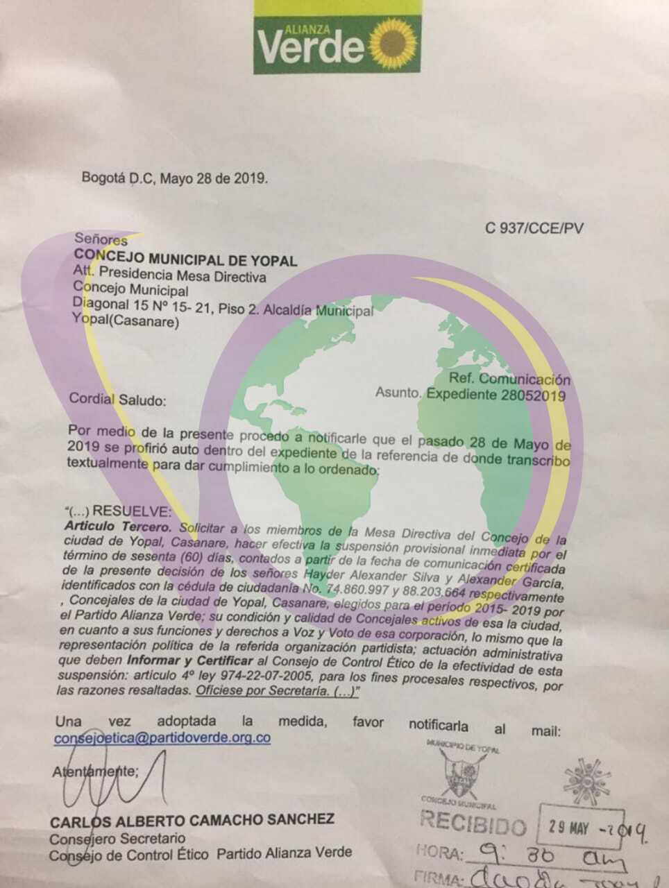 En comunicación radicada en el concejo de Yopal a las 9:30 a.m. el día de hoy 29 de mayo de 2019, el consejo de control ético del partido alianza verde suspendió de manera provisional a los concejales electos por ésta colectividad Heyder Silva y Alexander García.