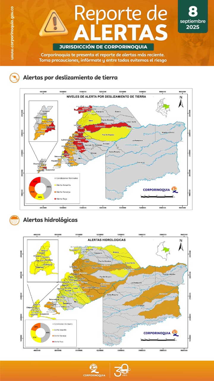 La Corporación Autónoma Regional de la Orinoquia (Corporinoquia) emitió el más reciente reporte de alertas por deslizamientos de tierra y eventos hidrológicos en los municipios bajo su jurisdicción, con base en el seguimiento de condiciones meteorológicas e hidrológicas.